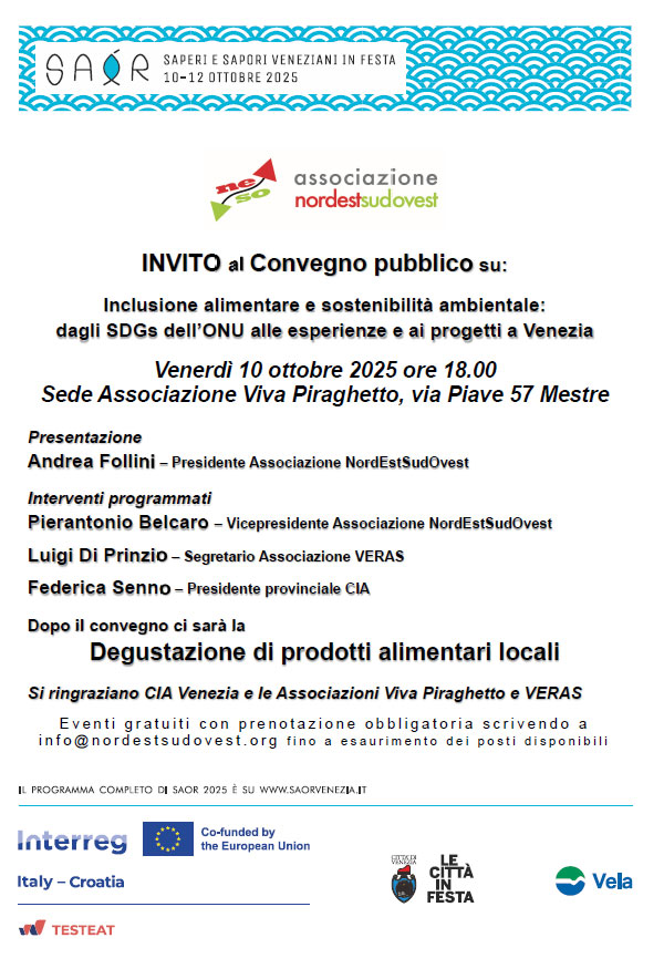 SAOR 2025 – Convegno e degustazione Inclusione alimentare e sostenibilità ambientale: dagli SDGs dell’ONU alle esperienze e ai progetti a Venezia 10 ottobre 2025 ore 18,00 Sede Associazione Viva Piraghetto – Via Piave 57 Mestre